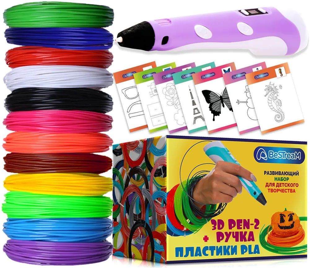 3D-ручка Bestream и 12 рулонов PLA пластика по 10м (35 трафаретов, защитный экран, фиолетовая)