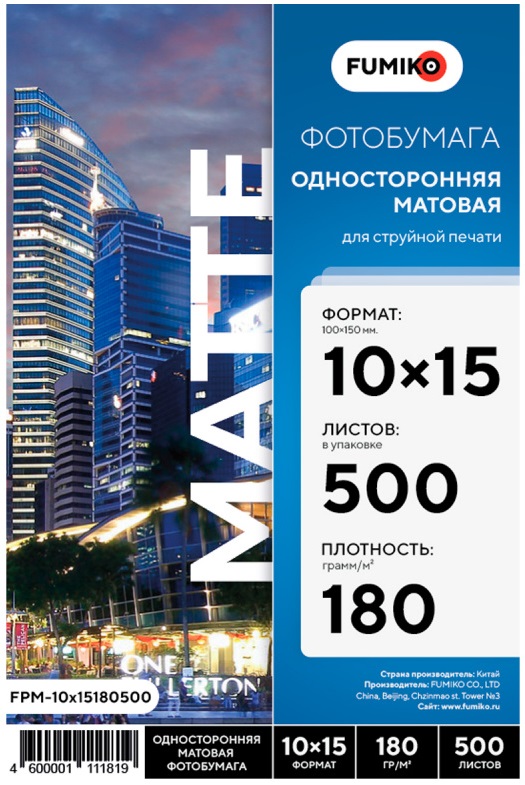 Фотобумага FUMIKO матовая односторонняя 180г/10x15/500л