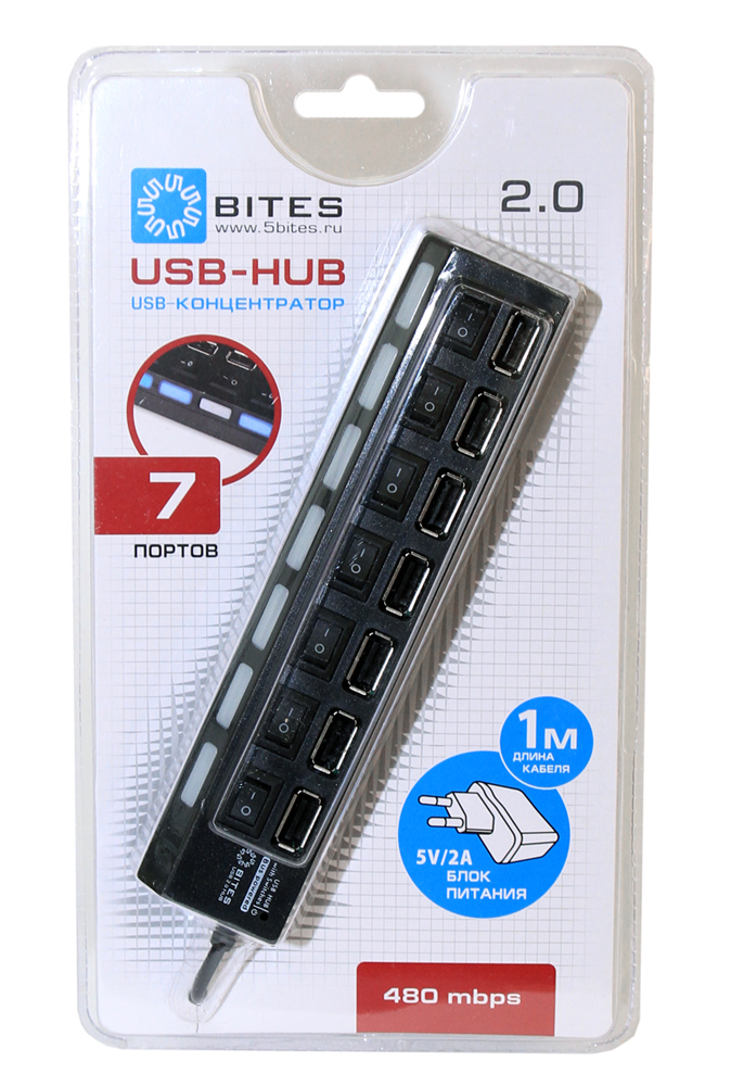 Концентратор USB-hub, USB2.0, 7-port, 5bites HB27-203PBK,7 x USB2.0, внешний блок питания, индивидуальные переключатели питания с индикац