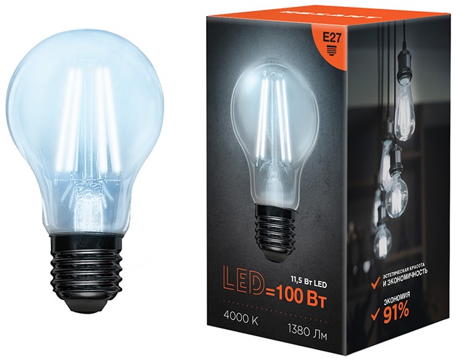 Лампа филаментная REXANT Груша A60 11.5 Вт 1380 Лм 4000K E27 прозрачная колба