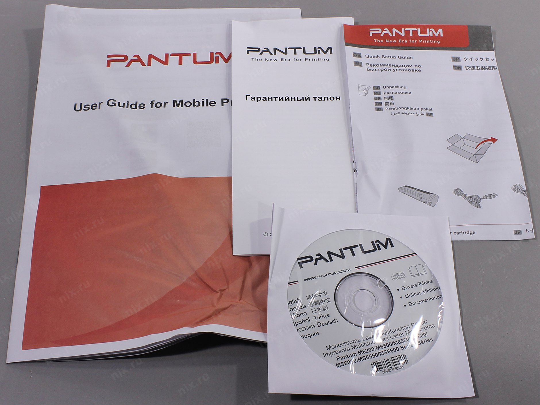 Диск с ПО, кабель USB, кабель питания, пробный картридж