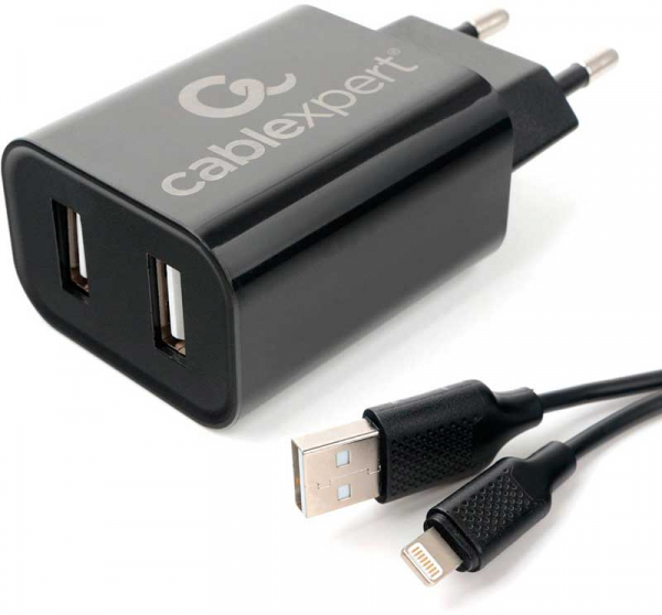Зарядное устройство Cablexpert MP3A-PC-36 USB 2 порта, 2.4A, черный + кабель 1м lightning